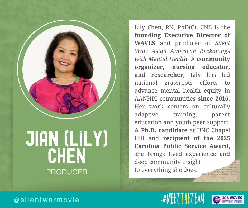 In addition to being the founder and Executive Director of WAVES, Lily Chen, RN, PhD(C), CNE is also the producer of Silent War: Asian American Reckonings with Mental Health.